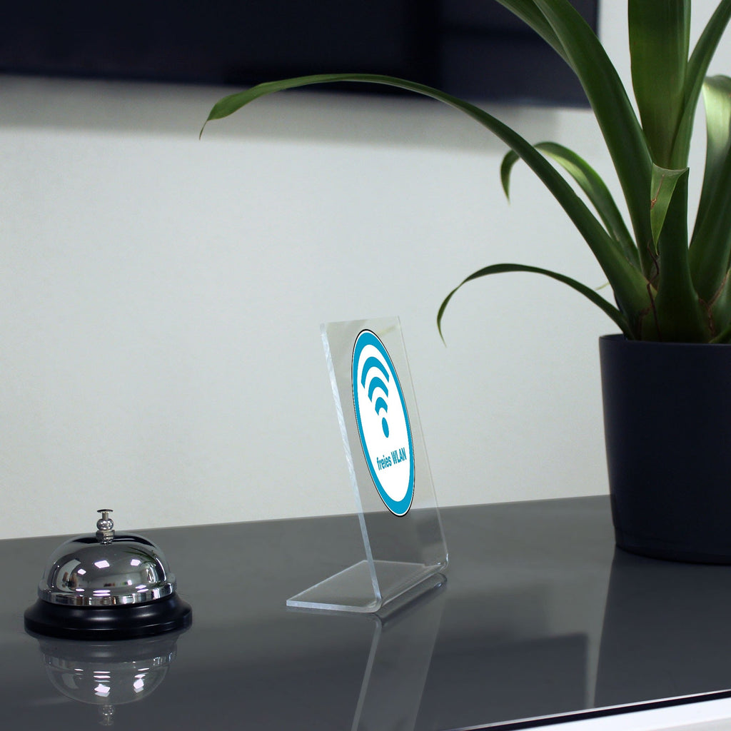 Hochwertig gedruckter L-Aufsteller aus Acryl. Die vordere Fläche hat die Maße von ca. 100x150 mm.