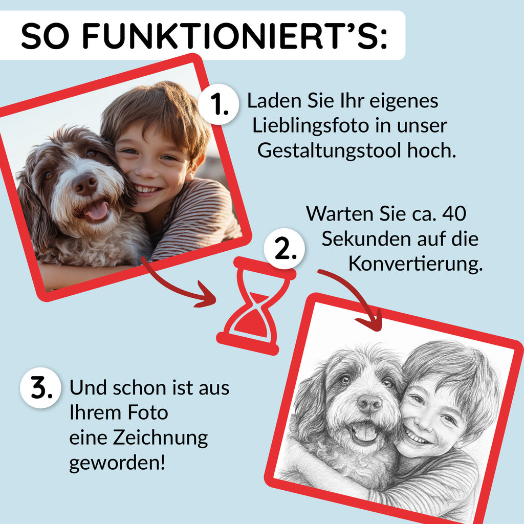 Laden Sie einfach Ihr Bild hoch, und wir verwandeln es in eine detailreiche Bleistiftzeichnung. Die hochwertige Druckqualität sorgt für brillante Farben und klare Konturen, damit Ihr Motiv dauerhaft schön bleibt.